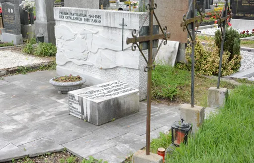 Auf dem Friedhof in Ebenthal / Žrelec ruhen drei gefallene Partisanen. Auf dem großen Grabstein (Breite 200cm, Höhe 100cm ) ist in beiden Landessprachen vermerkt: