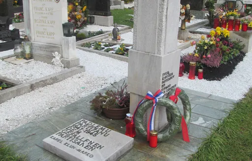 Partisan Karel Klun-Marko, originally from Gorenje village near Ribnica in Dolenjska, is buried in the cemetery next to the Šmihel/St. Michael ob Bleiburg parish church. He was born on 18 July 1926 and died on 25 November 1944 in Rute pri Bistrica nad Pliberkom/Ruttach bei Feistritz ob Bleiburg near the Biceljn farm (landlord Vinko Pečnik). He was also temporarily buried there. On 28 October 1947, partisan Mark was reburied in the parish cemetery in Šmihel/St. Michael ob Bleiburg. From then on, the grave a few steps east of the church was always well tended. It is adorned with flowers of love and respect. Even now, when the partisan's grave is marked by a new stone obelisk, the vase for flowers is never empty. The inscription on the monument is simple, carved in both regional languages: