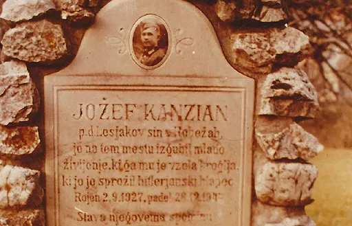 One day, a patrol of seven comrades fell into an ambush at Zavrh / Hintergupf and four fighters from the protection of the Provincial Committee lost their lives. The eldest son of the Lesjak-family from Robeže / Robesch, Jože Kanzian, was also killed at Zavrh / Hintergupf, and is buried in Apače / Abtei, but has a special memorial at Zavrh / Hintergupf with the inscription:
