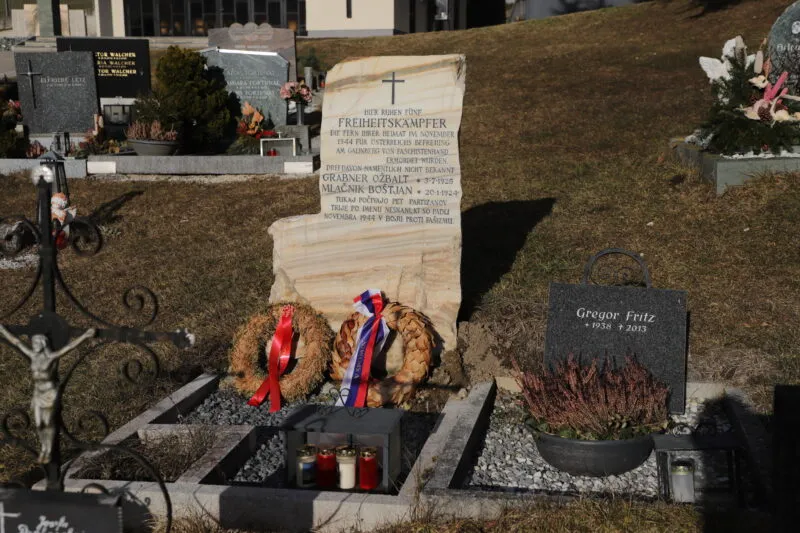 Še višje zgoraj za gričem, na katerem stoji cerkvica, se razprostira pokopališče. Med nagrobniki ni niti enega s slovenskim napisom, le nagrobnik partizanskih borcev nosi dvojezičen napis, vendar tudi šele od leta 1981 naprej, ko ga je Zveza koroških partizanov obnovila. Partizanski grob vzorno negujejo avstrijski tovariši, domačini. Na častnem mestu v osredju pokopališča je petim partizanskim borcem postavljen spomenik iz naravne skale z vklesanim napisom:
